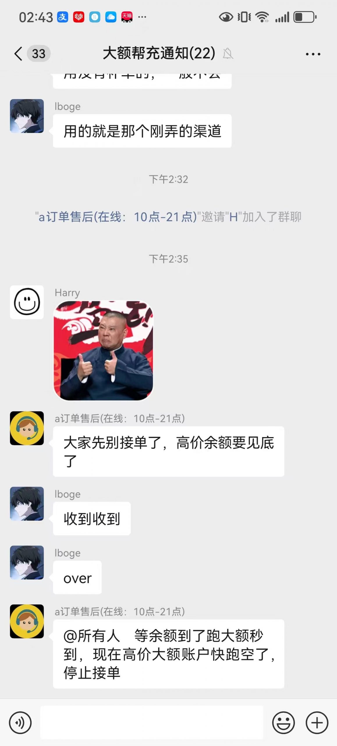 4,不是随机都能接单,我们给渠道打款都是预存,比如今天充10W,得等3天后才有10W到账,所以目前划到余额后,都是在抢着用余额,只有参与的人多,预存越多才行。今天我们又给渠道公司预充了20w。